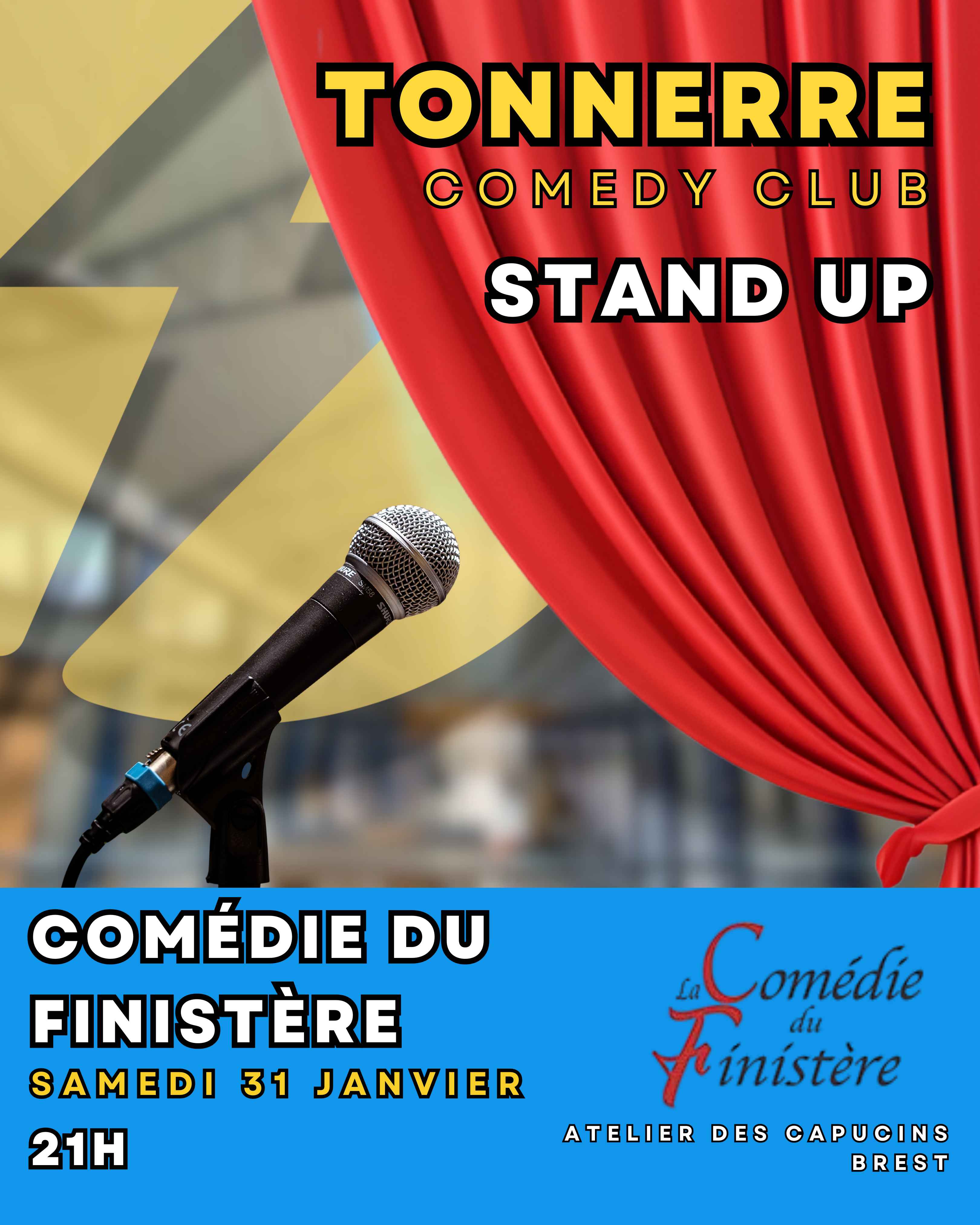 Le stand up du Tonnerre Comédie Club arrive à la Comédie du Finistère, aux Ateliers des Capucins, le spot incontournable du rire à Brest.